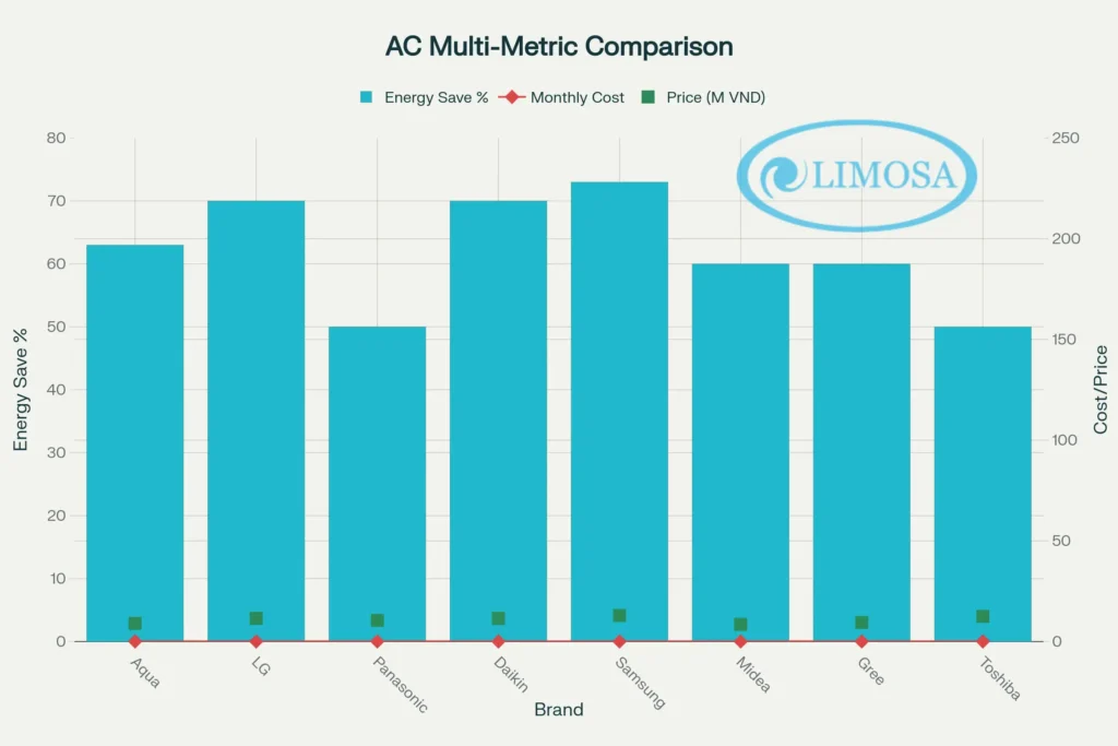 Để làm rõ hơn liệu máy lạnh Aqua có tiết kiệm điện không, chúng ta hãy cùng đối chiếu các tiêu chí quan trọng nhất về hiệu suất năng lượng giữa Aqua và một số thương hiệu phổ biến trên thị trường. Bảng so sánh dưới đây tập trung vào hệ số COP (Coefficient of Performance), công nghệ inverter và chứng nhận tiết kiệm điện để giúp bạn có cái nhìn trực quan và hữu ích.