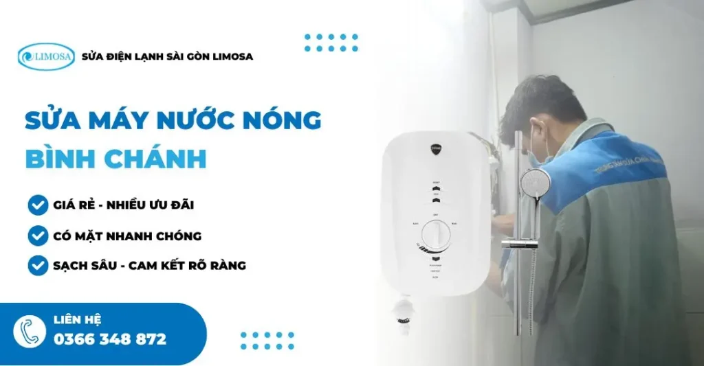 Sửa máy nước nóng Bình Chánh tại nhà giờ đây đã trở nên đơn giản, nhanh chóng và hoàn toàn đáng tin cậy nhờ Sửa Điện Lạnh Sài Gòn Limosa! Với đội ngũ kỹ thuật viên tận tâm, linh kiện chính hãng, giá cả minh bạch cùng bảo hành dài hạn, chúng tôi cam kết mang lại nguồn nước ấm ổn định, an toàn cho mọi gia đình tại Bình Chánh. Đừng chần chừ để sự cố kéo dài làm ảnh hưởng sinh hoạt, hãy liên hệ Sửa Điện Lạnh Sài Gòn Limosa ngay hôm nay qua HOTLINE 0366 348 872