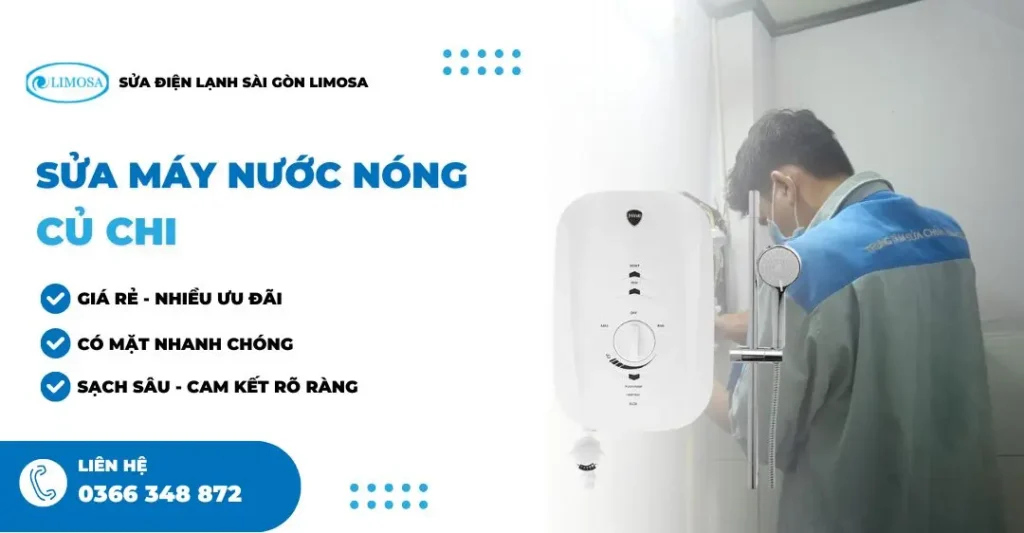 Sửa máy nước nóng Củ Chi chính là giải pháp tối ưu giúp gia đình bạn nhanh chóng có nước ấm ổn định, an toàn và tiết kiệm. Liên hệ ngay Sửa Điện Lạnh Sài Gòn Limosa qua HOTLINE 0366 348 872 hoặc fanpage để được hỗ trợ tận tình, linh kiện chính hãng và bảo hành dài hạn ngay hôm nay!