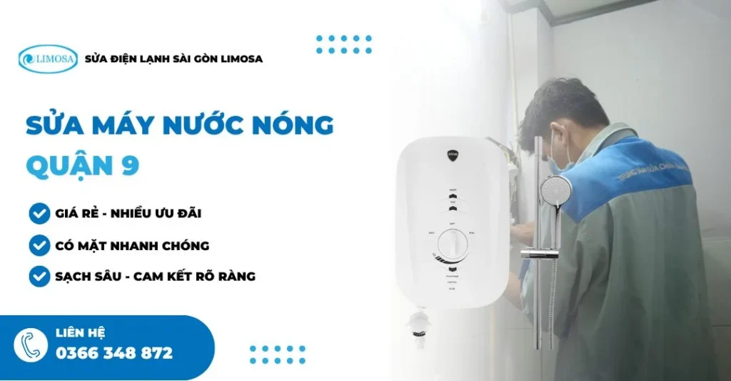 Sửa máy nước nóng quận 9 giờ đây không còn là nỗi lo khi bạn đã biết đến Sửa Điện Lạnh Sài Gòn Limosa. Đừng để sự cố máy nước nóng làm gián đoạn cuộc sống hàng ngày, hãy gọi ngay HOTLINE 0366 348 872 hoặc nhắn tin fanpage để được hỗ trợ tận tình. Chúng tôi luôn sẵn sàng đồng hành cùng bạn tại quận 9!